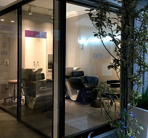 ブロンズガラスで仕切られたシャンプー室では、少し暗い照明と優しい音楽がヘッドセラピーやトリートメントをリラックスタイムにしてくれます。